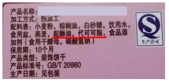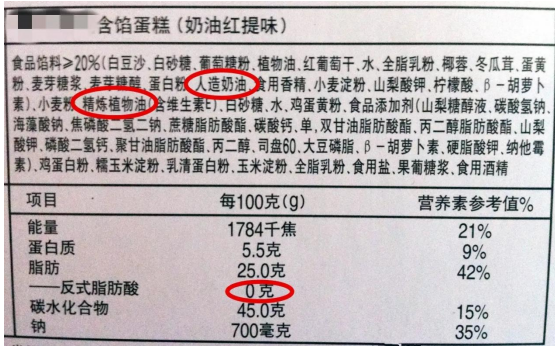 總結一下,凡是看到配料表成分名稱中含有(yǒu)“氫化”“酥油”“植脂”“人(rén)造油”“精煉油”“代可(kě)可(kě)脂”等字眼時(shí)大(dà)家(jiā)就要注意了,極有(yǒu)可(kě)能含有(yǒu)一定量的反式脂肪酸。